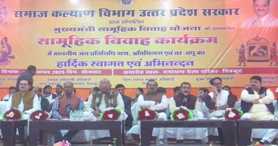 समाज कल्याण विभाग द्वारा संचालित मुख्यमंत्री सामूहिक विवाह योजना के अंतर्गत सोमवार को चित्रकूट के राष्ट्रीय रामायण मेला परिसर में भव्य सामूहिक विवाह कार्यक्रम का आयोजन किया गया। इस अवसर पर कुल 320 जोड़ों का विवाह हिंदू, मुस्लिम और बौद्ध धर्म की परंपराओं के अनुसार विधिवत संपन्न कराया गया। कार्यक्रम में बड़ी संख्या में जनप्रतिनिधि, प्रशासनिक अधिकारी और वर-वधु के परिजन उपस्थित रहे।