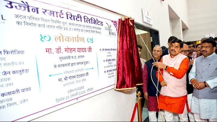 मुख्यमंत्री डॉ. मोहन यादव ने रविवार को उज्जैन में अटल परिसर स्थित 5.43 करोड़ की लागत के शॉपिंग कॉम्प्लेक्स और 28.31 करोड़ की लागत के कॉम्प्लेक्स का लोकार्पण और 10.75 करोड़ रुपए के पीएम ई बस सेवा योजना अंतर्गत बस डिपो एवं चार्जिंग अधोसंरचना निर्माण कार्य का भूमि-पूजन किया। इस अवसर पर मुख्यमंत्री डॉ. यादव ने अटल परिसर स्थित शॉपिंग काम्प्लेक्स और स्पोर्ट्स कॉम्प्लेक्स का अवलोकन भी किया। उज्जैन स्मार्ट सिटी लिमिटेड द्वारा स्मार्ट सिटी मिशन के तहत अटल परिसर स्थित परिसर में स्विमिंग पूल, क्लब हाउस तथा स्पोर्ट्स कॉम्प्लेक्स का निर्माण किया गया है। मुख्यमंत्री डॉ. यादव ने नवनिर्मित कॉम्प्लेक्स का निरीक्षण करते हुए निर्माण की सराहना की।