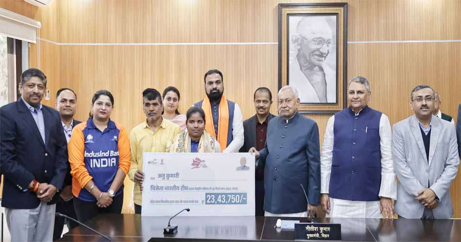 बिहार के मुख्यमंत्री नीतीश कुमार ने पटना स्थित 1 अणे मार्ग के ‘संकल्प’ सभागार में प्रथम नेत्रहीन महिला टी20 विश्व कप 2025 जीतने वाली भारतीय टीम की खिलाड़ी अनु कुमारी को सम्मानित किया। इस दौरान मुख्यमंत्री ने उन्हें चेक और अंगवस्त्र देकर सम्मानित करते हुए उनकी उपलब्धि की सराहना की।