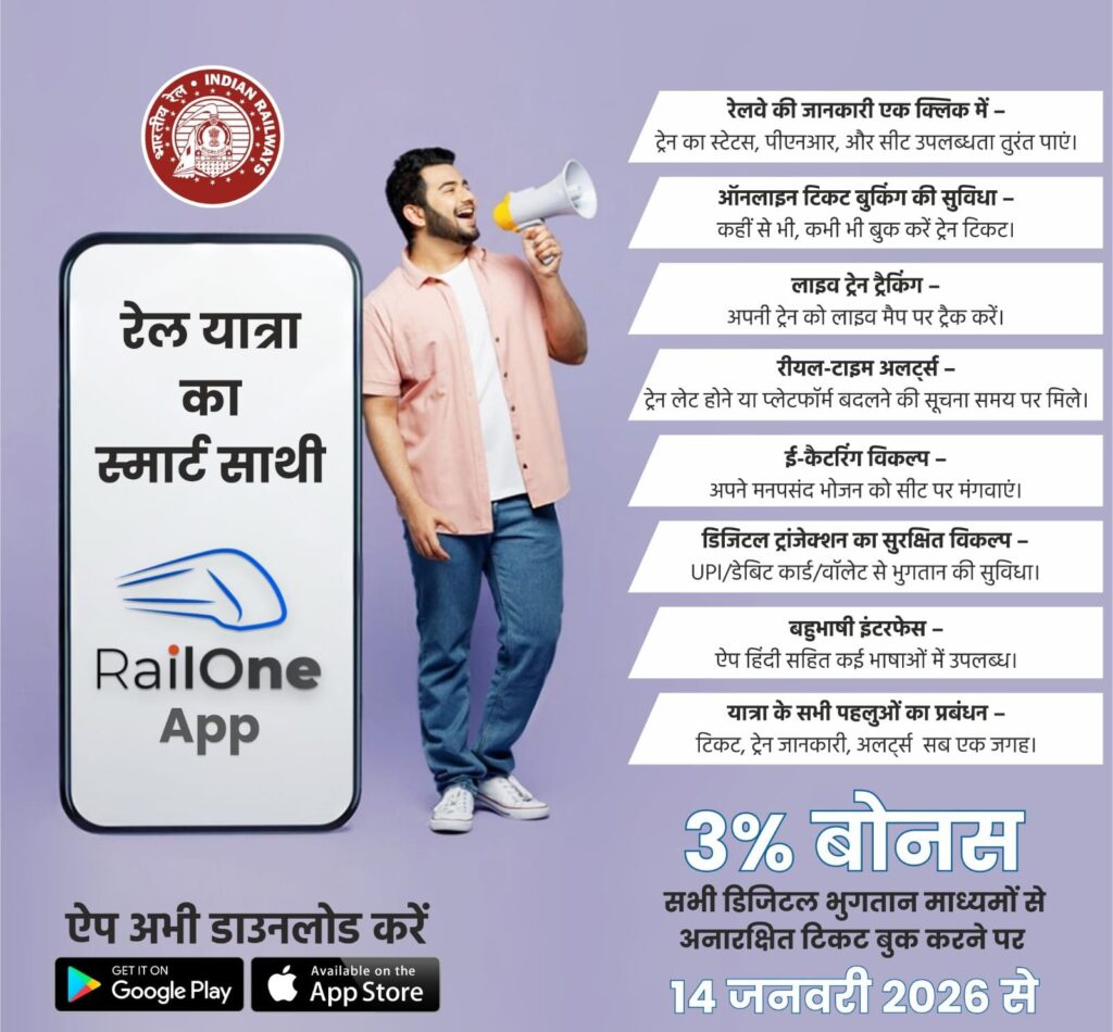 को इस तरह डिज़ाइन किया गया है कि कोई भी उपयोगकर्ता आसानी से जानकारी प्राप्त कर सकेरेलवन ऐप पर सभी डिजिटल भुगतान माध्यमों से अनारक्षित टिकट बुक करने पर 03 प्रतशत की छूट प्रदान की जा रही है। रेलवन ऐप का उपयोग अधिकाधिक यात्रियों का करना चाहिए तथा इसका लाभ उठाना चाहिए। रेलवन ऐप यात्रियों के लिए वन स्टाप सोल्यूशन के रूप में विकसित की जा रही है। इसका उपयोग कोई भी यात्री जिसके पास स्मार्टफोन है वह बडी आसानी से इसको उपयोग में ले सकता है। रेल मंत्रालय द्वारा डिजिटल बुकिंग को बढ़ावा देने के उद्देश्य से, रेलवन ऐप पर सभी डिजिटल भुगतान माध्यमों से रेलवे के अनारक्षित टिकट बुक करने पर 03 प्रतिशत की छूट प्रदान करने का निर्णय लिया गया है। यह प्रावधान आर-वॉलेट को छोड़कर रेलवन ऐप पर अनारक्षित टिकट बुक करने और डिजिटल भुगतान करने पर लागू होगा। रेलवन ऐप पर आर-वॉलेट के माध्यम से अनारक्षित टिकट बुक करने की स्थिति में, 3 प्रतिशत बोनस कैशबैक के रूप में प्रदान करने की वर्तमान प्रणाली जारी रहेगी। उपर्युक्त 3 प्रतिशत छूट का प्रस्ताव 14.01.2026 से 14.07.2026 की अवधि के दौरान लागू रहेगा। इसके बाद सेंटर फॉर रेलवे इंफॉर्मेशन सिस्टम (सीआरआईएस) द्वारा इस की समीक्षा कर निर्णय लिया जायेगा।रेलवन ऐप का मुख्य उद्देश्य यात्रियों को रेलवे से जुड़ी जानकारी तेज़, सरल और एक ही प्लेटफ़ॉर्म पर उपलब्ध कराना है, ताकि यात्रा की योजना बनाना और जानकारी प्राप्त करना आसान हो सके। रेलवन ऐप यात्रियों को एक बेहतर डिजिटल अनुभव प्रदान करने की दिशा में एक कदम है।